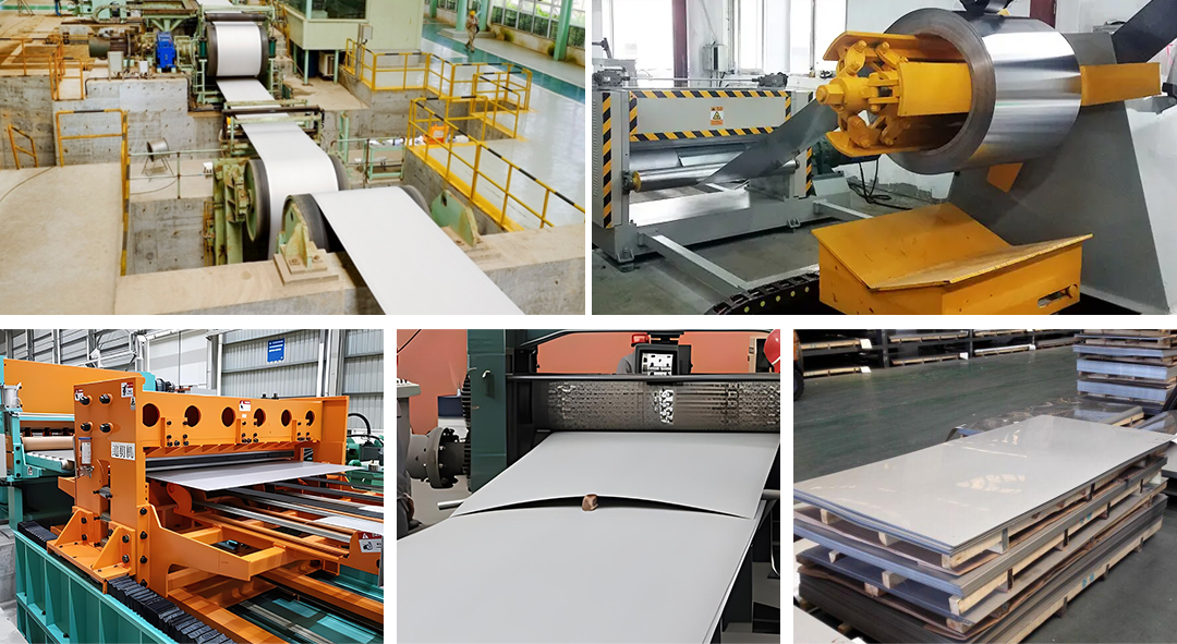 The main raw material of stainless steel sheet is stainless steel coil, usually stainless steel coil produced by cold rolling or hot rolling process. Stainless steel coil in the production process may be stained with rust, oxide and other impurities, need to be removed by pickling process. Pickling ensures a clean and smooth surface for subsequent processes. Stainless steel coils can be cold rolled or hot rolled after pickling. Cold rolling is the process of passing the coil through the roller to make the desired thickness while improving the surface finish. Hot rolling is to roll the coil to the required thickness under high temperature conditions, which is suitable for the production of thick plates.